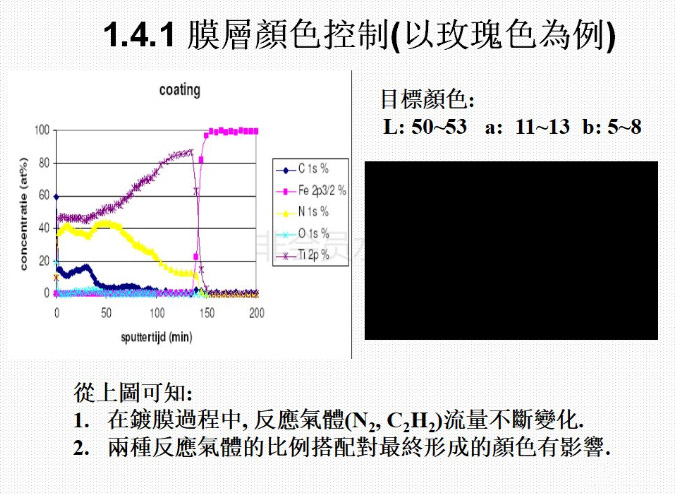 6)、目前能夠做出的膜層的顏色有深金黃色,淺金黃色,咖啡色、古銅色、灰色、黑色、灰黑色,七彩色等。通過控制鍍膜過程中的相關參數,可以控制鍍出的顏色;鍍膜結束后可以用相關的儀器對顏色值進行測量,使顏色得以量化,以確定所鍍出的顏色是否滿足要求。
