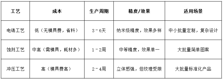 表面粗糙度可達納米級,圖形邊緣光滑無毛刺,支持復雜效果(立體凸字、鏡面、拉絲紋、十字紋等)。